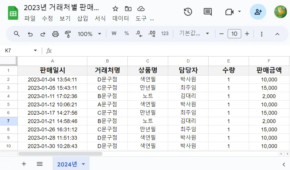 아래 시트는 2023년 물건 판매 내역을 담고 있습니다.