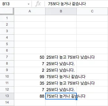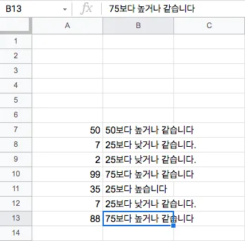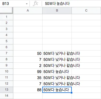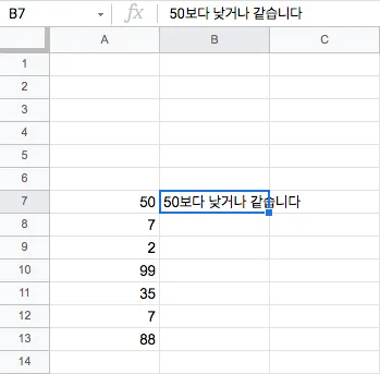 7행 1열 셀 A7 에 입력된 숫자 50은 "50보다 높은 수" 라는 조건에 해당되지 않기 때문에 else 문의 코드가 실행되어, 7행 2열 셀 B7 에 "50보다 낮거나 같습니다" 가 반환됩니다.