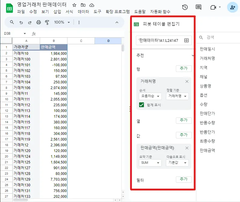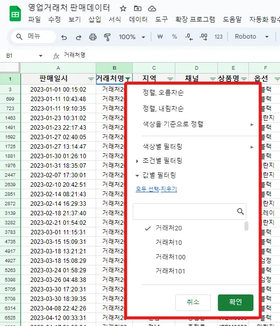 거래처별 판매금액을 알고 싶다면, 스프레드시트에서 제공하는 필터 기능이나 함수 기능을 사용할 수 있습니다. 데이터 수가 적고, 데이터 수정 빈도가 낮다면 스프레드시트에서 제공하는 필터, 피벗 기능이나 기본 함수만으로도 데이터를 보는데 불편함이 없을지 모릅니다.