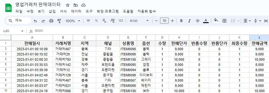 회사에서 자주 사용하는 스프레드시트에는 어떤 한계가 있을까요? 회사에서 아래와 같이 매출을 관리하고 있다고 가정해보겠습니다.