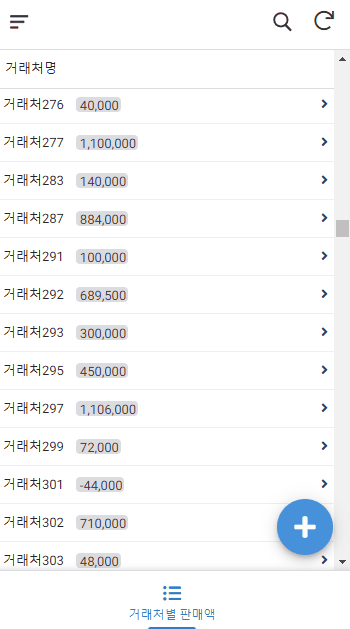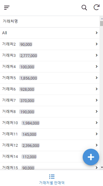 구글 스프레드시트로 앱시트를 만들면 아래와 같이 모바일에서도 거래처별 판매 금액을 한 눈에 확인할 수 있습니다. 그리고 단계별로 판매금액을 분석할 수도 있으니 유용하겠죠?
