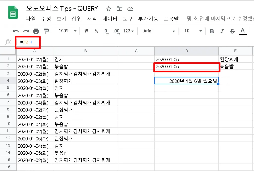 구글 쿼리로 불러온 날짜가 정상적으로 날짜로 인식되는지 체크해보기 위해 1을 더해보면, 정상임을 알 수 있습니다. 만약 텍스트 형식이라면 #VALUE 값이 표시될 것입니다.