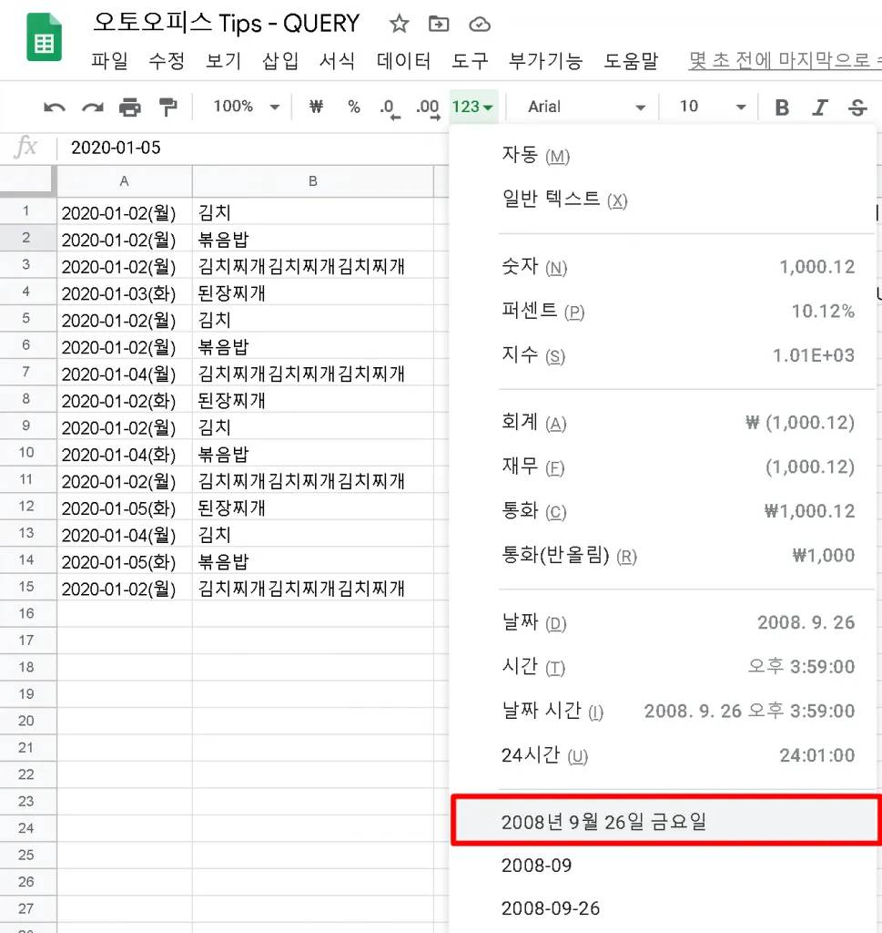 그런데, 셀 형식을 아무리 바꾸어보아도 쿼리로 불러온 날짜는 꿈쩍하지를 않습니다. +1을 한 셀은 형식을 적용하는 대로 잘 바뀌는데 말이죠.