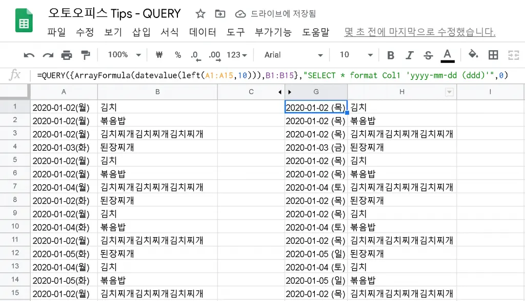 앞에 10자리를 불러오는 함수로 LEFT를 사용했는데, 이제 LEFT로 불러온 값을 숫자로 바꾸어주는 것으로 해결이 됩니다. ARRAYFORMULA는 DATEVALUE 를 한 값에 더해줍니다.