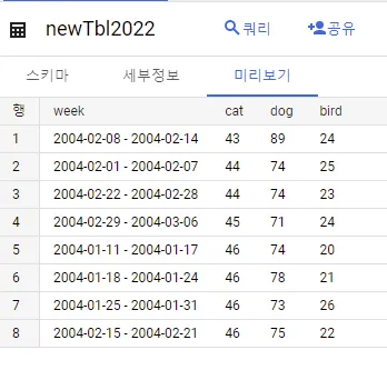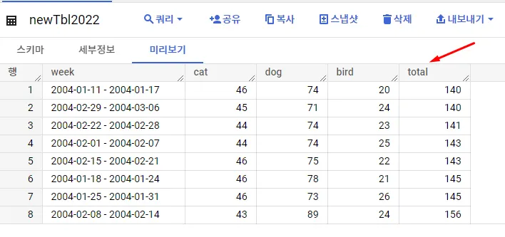 빅쿼리 편집기에서 다음과 같이 쿼리를 작성하면 간단하게 cat, dog, bird 수를 합한 total 값을 확인할 수 있습니다.
