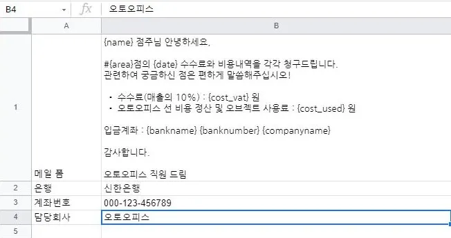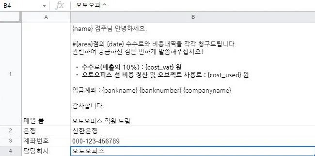 {companyname} : "메일 전송 내용" 시트의 B4 셀에 입력된 데이터가 대치될 위치입니다.