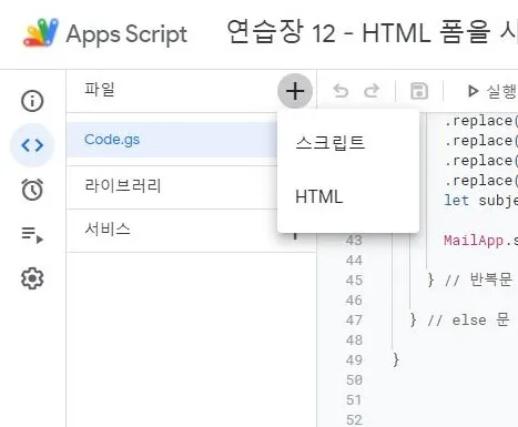 편집기에서 좌측 상단의 "파일" 라인 오른쪽에 "+" 버튼을 클릭 시, 스크립트 파일과 HTML 파일 중 추가할 파일 형식을 묻는 드롭다운이 생깁니다.