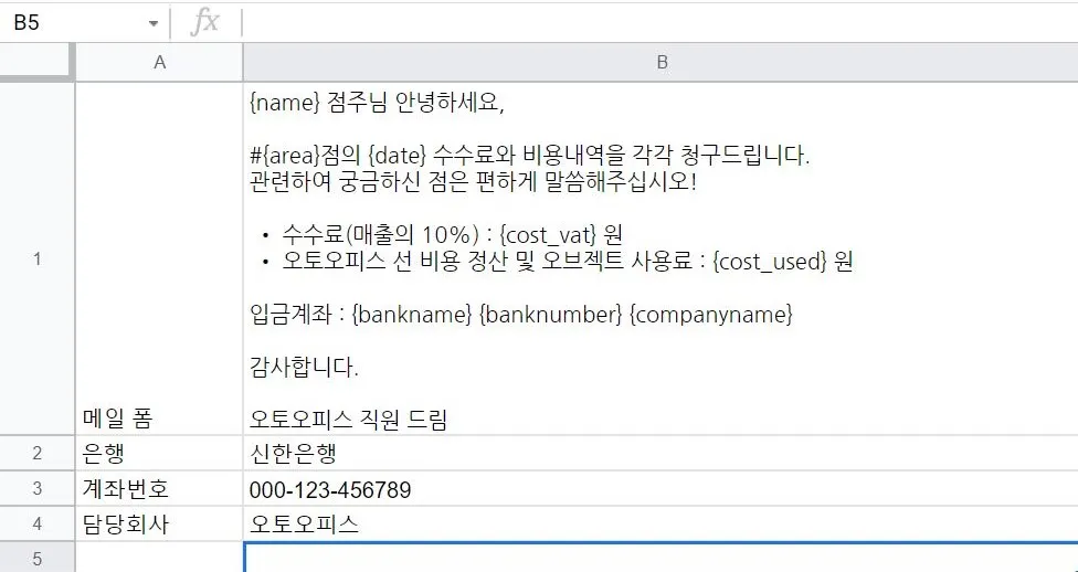 {bankname} : "메일 전송 내용" 시트의 B2 셀에 입력된 데이터가 대치될 위치입니다.