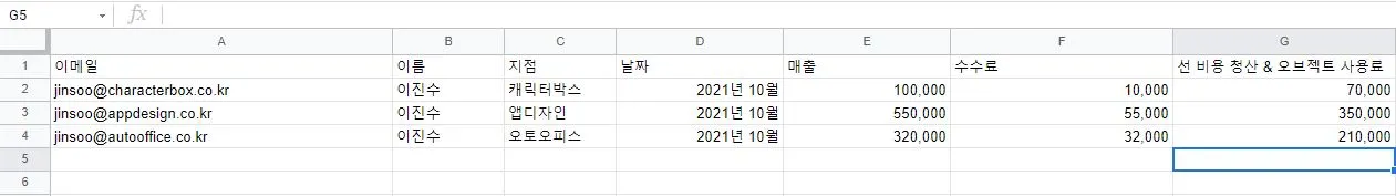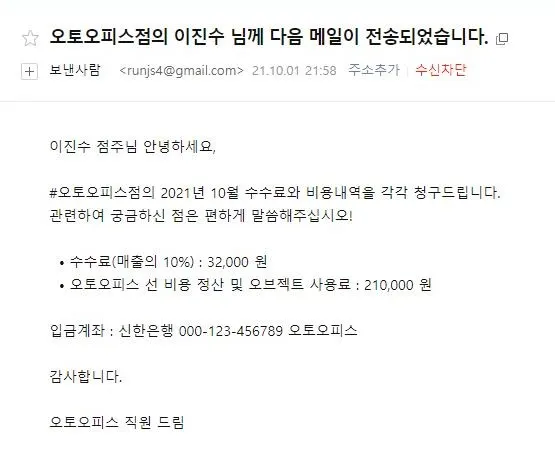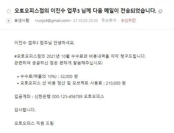 예를 들어 다음처럼 당월 수수료와 비용 내역을 계산하여 메일 전송 대상자에게 청구하는 메일을 전송해 보겠습니다.