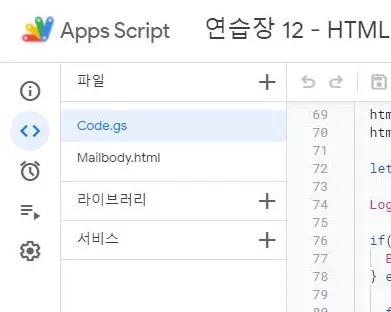 구글 스프레드시트의 스크립트 편집기를 사용하여, 사용자가 전송하기 원하는 이메일 주소로 HTML 요소를 추가하여 편집한 메일을 전송하는 기능을 익힙니다.