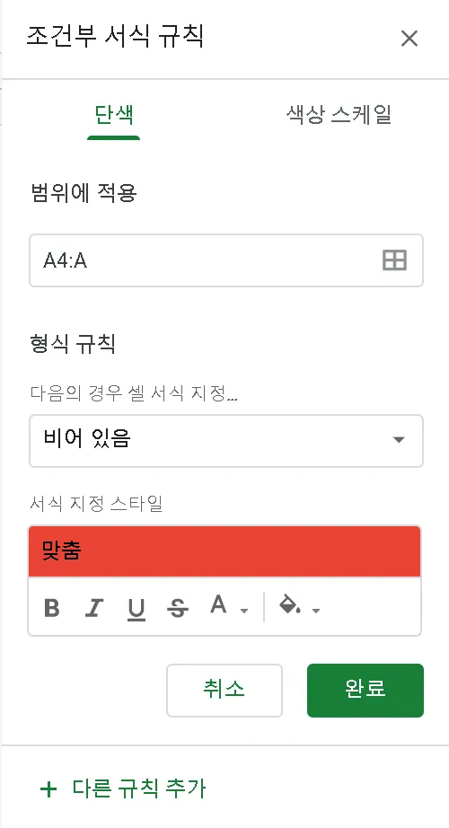 여기에 조건부 서식을 하나 더 걸어주면 됩니다. 동일한 범위로 셀이 비어있으면 색상을 칠하지 않는 것으로 조건부 서식을 하나 더 만들고, 위치를 올려서 빨간색보다 위에 놓아줍니다.