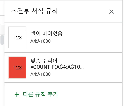 또한 행의 값에는 절대참조 $ 를 넣어주어야 합니다. 만약 넣어주지 않는다면, 중복인 데이터 중 가장 먼저 넣은 데이터만 빨간색으로 표시가 됩니다.
