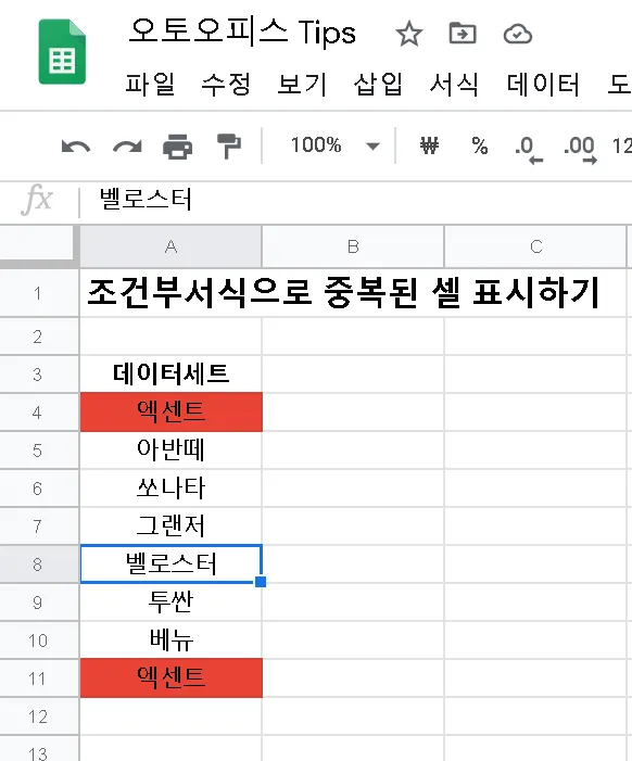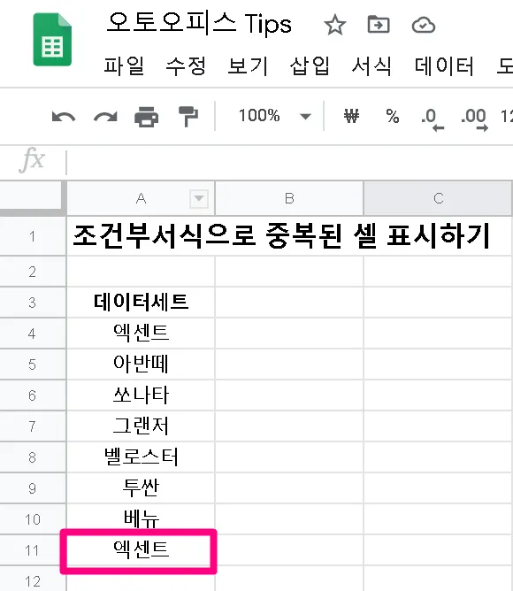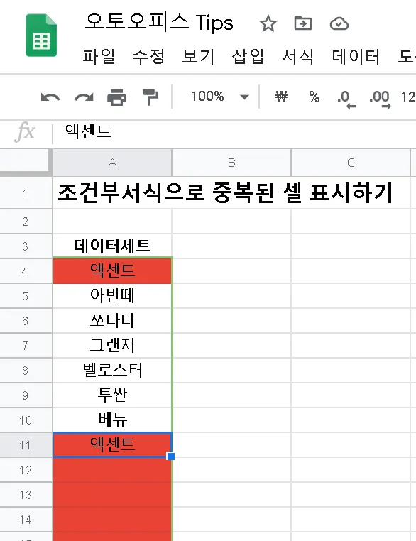 A4에 이미 입력된 엑센트를 A11에 중복으로 입력했을 때, 해당 셀을 빨간색으로 표시하고자 합니다.