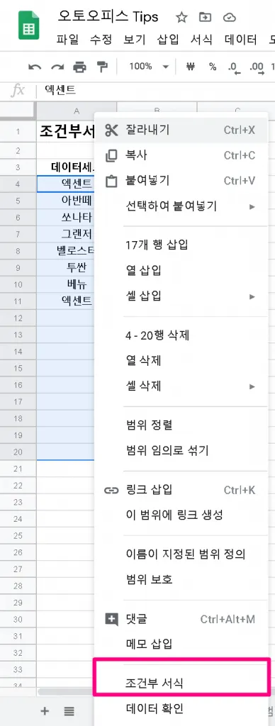 우선, 조건부 서식을 지정할 셀 범위를 선택하고, 오른쪽 클릭 메뉴로 조건부 서식에 들어갑니다.