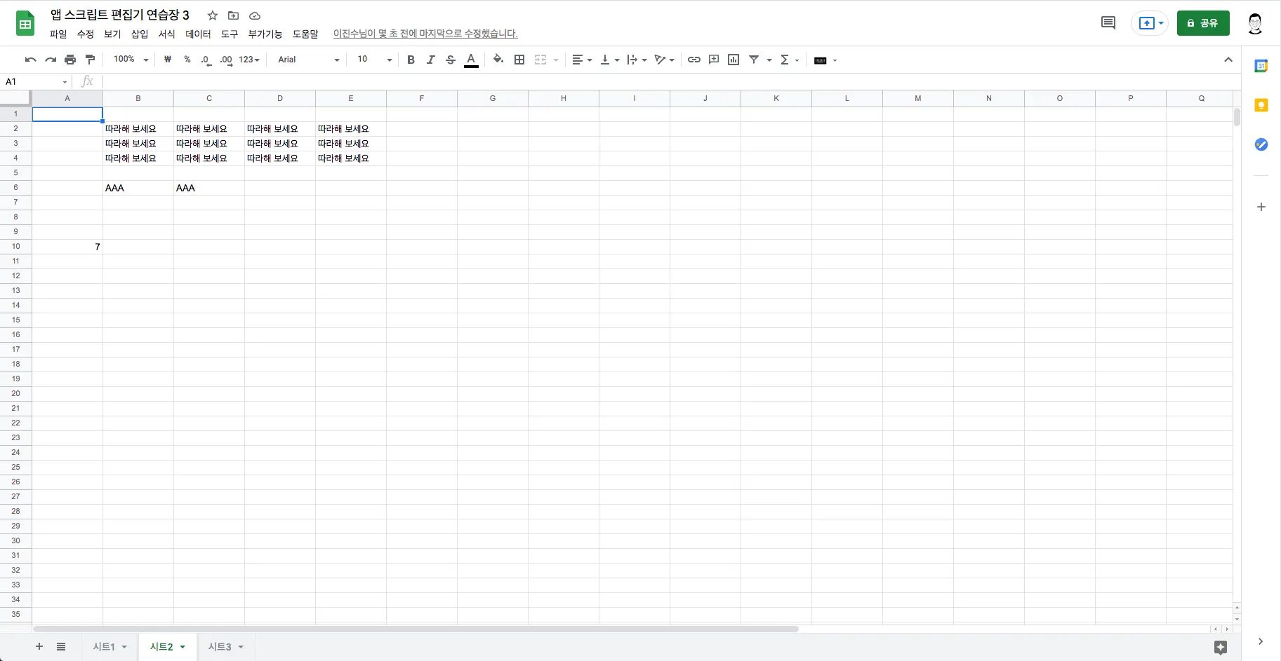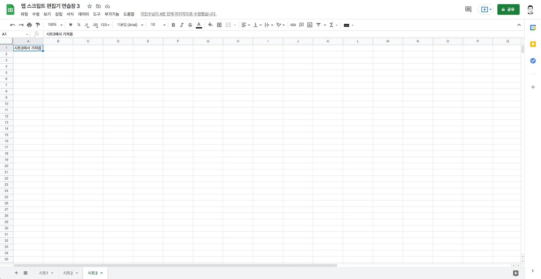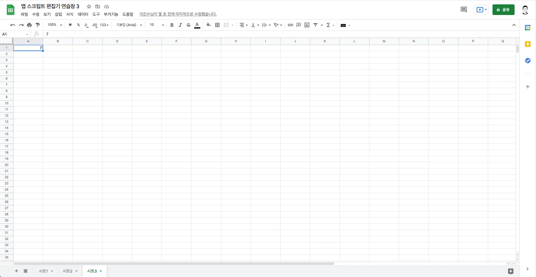 스크립트 실행 전 시트 3의 A1 셀에 "7" 대신 "시트3에서 가져옴" 을 입력한 상태.